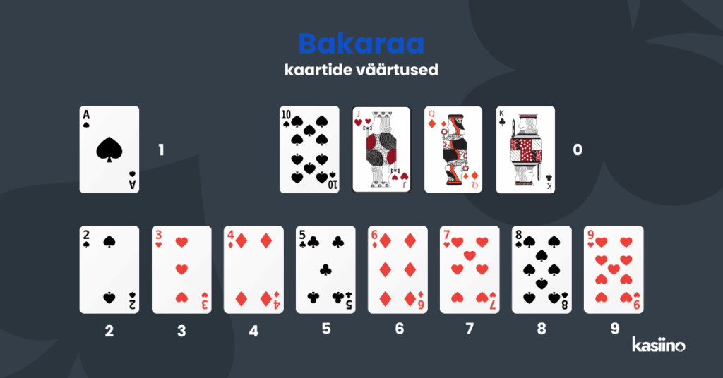 Bakaraad mängides omavad numbrikaardid oma nominaalväärtust, äss on väärtuselt 1 ning pildikaardid annavad 0 punkti. Seega, kui mängija saab kätte näiteks 7 ja 8, on kogusumma 5 (sest 7+8=15, arvestame ainult ühte numbrit). Samamoodi loeb ka pankur, mistõttu on bakaraa arvestused üsnagi kergesti meeldejäetavad. See süsteem tagab kiire tempoga mängu, kus maja teenib tulu peamiselt läbi maja eelise. Kõik kaardid loevad vaid ühekohalise väärtusena, mis tähendab, et 10 või suurema summa puhul lahutatakse automaatselt 10.