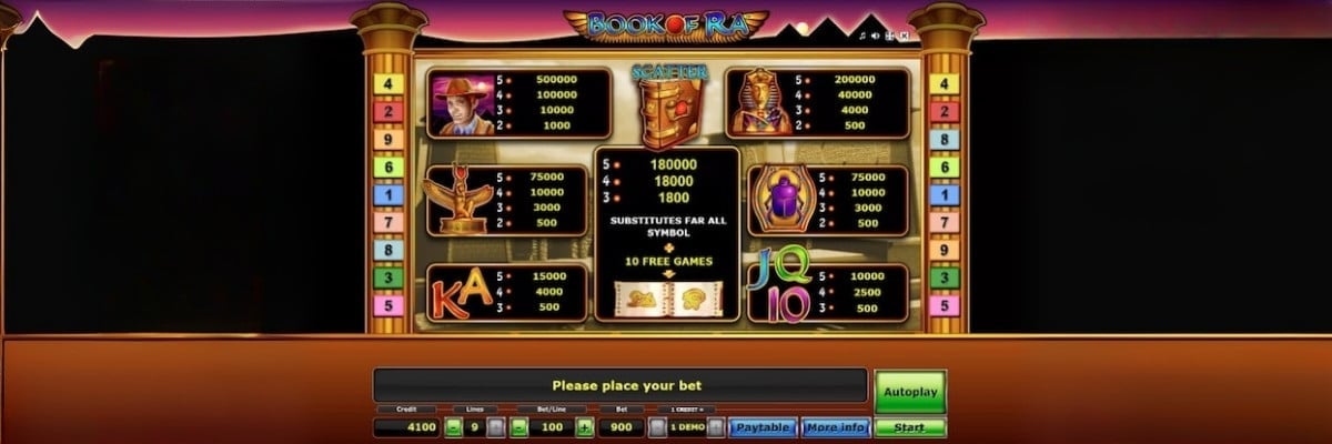Book of Ra (Бук оф Ра) – легендарный слот от Greentube, выпущенный в 2005 году. Игровой автомат использует сетку 5×3 с 9 линиями выплат, RTP 96% и высокую волатильность. Максимальный выигрыш составляет 5000x ставки. Безопасность игры для гемблеров гарантирует наличие механизма ГСЧ (RNG).