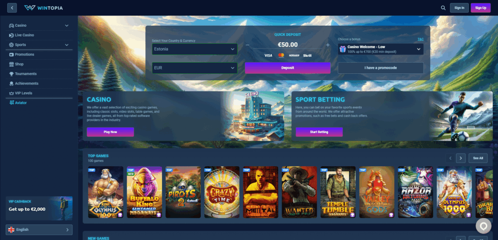 В онлайн казино Wintopia представлено более 8000 различных игр от самых известных мировых производителей игр. Существуют различные типы игровых автоматов, настольные игры казино, а лайв казино предлагает сотни лайв настольных игр и игр-шоу. Кроме того, предлагаются и ставки на спорт, качество услуг в целом очень высокое. Бонусы в этом онлайн казино также хороши.